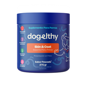Dogelhty Skin & Coat es un suplemento formulado por veterinarios que contiene una poderosa mezcla de ingredientes naturales que trabajan en conjunto para mantener una piel sana, reducir la caída excesiva del pelo, prevenir la sequedad, la descamación y la irritación de la piel, así como a mejorar la textura y el brillo del pelaje. Además, es libre de granos, rellenos e ingredientes artificiales y tiene un delicioso sabor a pescado que le encantará a tu mejor amigo.