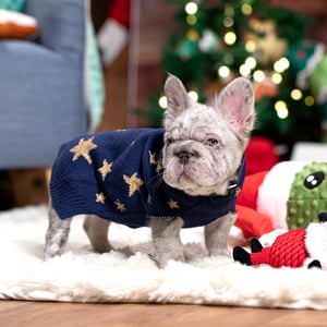 Merry Makings Holiday Suéter Azul Patrón Estrellas Doradas para Perro, X-Chico