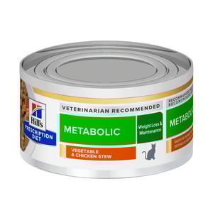 Hill's Prescription Diet Metabolic ha sido formulado por veterinarios y especialistas específicamente para ayudar a gatos adultos a perder peso o mantener la pérdida de peso de manera eficaz y saludable. Este alimento estimula la capacidad natural para quemar grasa y estimula el metabolismo, al mismo tiempo que los mantiene sanos y activos. Cuenta con una mezcla única de fibras para una mayor sensación de saciedad y está bañado en una deliciosa salsa que a tu gato le encantará.