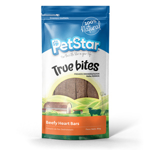 True Bites de PetStar son deliciosos premios deshidratados 100% naturales ideales para consentir a tu perro o para premiar durante las clases de entrenamiento. Sin aditivos ni conservadores gracias al proceso de deshidratado para mantener todo el sabor y nutrientes.