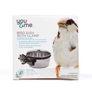 You & Me acero inoxidable Coop Cup con abrazadera, es de tamaño pequeño para aves y otras mascotas pequeñas, el soporte de abrazadera se conecta fácilmente a cualquier jaula y en cualquier de cualquier estilo.