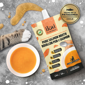 El caldo de salmón de Ikai es el perfecto topper para hacer que cada plato de croquetas se vuelva más atractivo. Elaborado con solo carne de salmón fresco de la Patagonia chilena. Es naturalmente rico en omegas 3, colágeno y bajo en sodio y calorías. Es ideal para mantener a los gatos activos, hidratados y con una piel, pelo y articulaciones saludables.