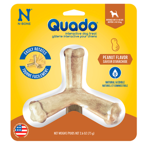 Quado de N-Bone es un premio interactivo que te ayudará a brindar a tu canino toda la diversión de un juguete interactivo con las ventajas de una super herramienta para el cuidado bucal, un premio completamente digestible hecho con ingredientes naturales complementados con un diseño ergonómico ideal para ayudar a reducir el sarro y la placa, proporcionar un aliento fresco al tiempo que mantiene a tu perro entretenido y ayuda a redireccionar comportamientos destructivos.