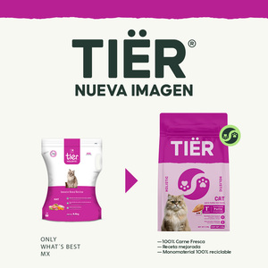 cambio de alimento, para acostumbrarlo a TIËR hágalo gradualmente en un periodo de una semana, ya que un cambio repentino en el alimento puede provocar trastornos gastrointestinales. Guarde el paquete cerrado en un lugar seco y fresco, protegido de la luz solar directa.