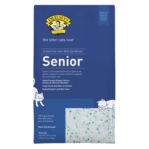 Senior es arena especializada que absorbe eficazmente la orina y los olores al contacto y los atrapa para mantener limpia el área genital ayudando a prevenir infecciones del tracto urinario y padecimientos como la insuficiencia renal en gatos. Diseñada con finos gránulos de sílice que son suaves y amables con las patitas de los gatos senior, y que además, recubren y deshidratan los desechos reduciendo el olor. Dr. Elseys es arena de sílice infusionada con atrayentes herbales para atraer a los felinos a su caja de arena, formulada especialmente para cuidar a tu compañero de aventuras senior.