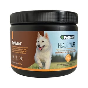 SKU 107567Healthy Life de Petmet es un complemento alimenticio 100% natural en polvo elaborado con aceite de pescado de aguas frías que mejora la salud de la piel y pelaje de tu mejor amigo gracias a los ácidos grasos esenciales omega -3. Healthy Life ayuda a tu mascota a prevenir problemas comunes como: caída excesiva de pelo, enfermedades de la piel e inclusive resequedad en las orejas. Con un práctico diseño Healthy Life te entrega un producto en polvo palatable con calidad de grado humano para que puedas espolvorear el alimento de tu canino una vez al día y mejorar su calidad de vida.