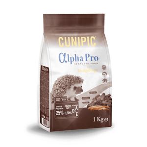 Cunipic Alpha Pro para erizo, es un alimento que incorpora como primer ingrediente la harina de tenebrio, al ser extraordinariamente bueno para estos animales de compañía, se encuentra incluido en una cantidad generosa, siendo el principal ingrediente, todos los demás ingredientes son libres de transgénicos (no OGM), y 3 fuentes de grasa consiguiendo aportar un alto grado de omega 3 y 6, así como de otros ácidos grasos esenciales y vitaminas. Este alimento es hiposódico (bajo nivel de sodio), esto lo diferencia de otros alimentos para erizo o para gatos que pueden causar problemas renales o de cálculos en los erizos a largo plazo, se incorporó extracto de yuca que neutraliza el olor desagradable de las heces.