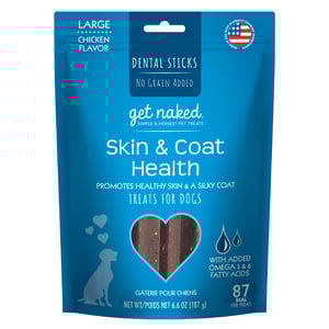 SKU 141991Skin & Coat de Get Naked son sticks dentales adicionados con ácidos grasos omega -3 y -6 que ayudan a promover una piel saludable y un pelaje lustroso. Una deliciosa formula libre de granos con sabor a pollo que incluye super ingredientes como linaza orgánica y aceite de arenque en un diseño y textura ideal para ayudar a reducir la placa y sarro de las piezas dentales al tiempo que tu perro disfruta masticando. Todos los beneficios de un premio más el apoyo dental y una piel más sana y un pelaje increíble.