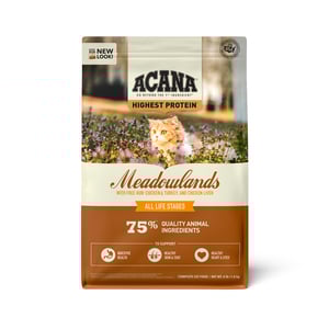 - Acana Meadowlands Alimento Natural Alto en Proteína para Gato Receta Pollo y Pavo, 4.5 kg >PRODUCTOS>Gato>Alimento>Alimento Natural>Alimento Natural Seco>Alimento Natural Seco Todas las Edades>Acana Meadowlands Alimento Natural Alto en Proteína para Gato Receta Pollo y Pavo, 4.5 kg