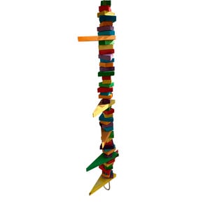 Este juguete de cuñas o gajos de maderas coloridas de A&E Happy Beak, proporcionara horas de diversión masticando y jugando para tus aves. Incluye diferentes tamaños y formas de madera de colores brillantes, todas sobre una cadena de acero inoxidable, que lo hará mas resistente. Ideal para aves de tamaño mediano, que se mantendrán entretenidos, masticando, y trepando con el pico este juguete. Recuerda que es indispensable ofrecer enriquecimiento al habitat de tus aves, para evitar comportamientos indeseados que pueden afectar su salud.