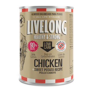 Livelong Healthy & Strong Pollo y Camote es un alimento 100% natural para perros que contiene un 90% de carne de pollo. Además, incluye camote y vegetales orgánicos, y está libre de granos de cualquier tipo. Esta dieta proporciona una proteína de alta digestibilidad que ofrece todos los aminoácidos esenciales para una nutrición completa. Para aumentar su valor nutricional y proporcionar una mejor fuente de proteínas, se ha combinado la receta de pollo con pavo y también con hígado de pollo, ya que es una excelente fuente de vitaminas y hierro.