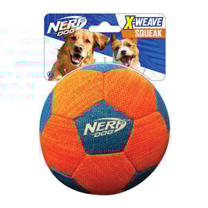 - Juguete suave y ligero con diseño de balón de fútbol con squeaker de la marca Nerf para perros.