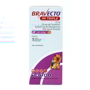 Bravecto 1M Triple es una tableta masticable de dosis única para perros de 1.27 a 2.5 kg, protege contra parásitos internos y externos. Ayuda a prevenir y eliminar pulgas, garrapatas, nematodos gastrointestinales y ácaros (incluidos los del oído y la demodicosis). Además, su uso continuo ayuda a prevenir la dirofilariosis (gusano del corazón) y la enfermedad de Chagas provocado por las chinches besuconas. Su delicioso sabor a hígado de cerdo facilita su administración y ofrece hasta 37 días de protección.