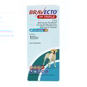 - Bravecto 1M Triple Tableta Masticable Antiparasitaria Externa e Interna para Perro, 20 a 40 kg >PRODUCTOS>Bienestar para tu Mascota>Farmacia Perro>Desparasitantes>Bravecto 1M Triple Tableta Masticable Antiparasitaria Externa e Interna para Perro, 20 a 40 kg