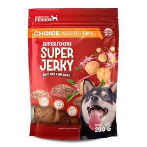 Consiente a tu mejor amigo con los premios Super Jerky de Choice Nutrition, snacks de carne seca en tiras, 100 % naturales, ideales para perros adultos de todas las razas. Sus deliciosas recetas están elaboradas con superalimentos, ingredientes conocidos por tener un alto valor nutrimental, ricos en fibra y antioxidantes, que promoverán una suave digestión y protegerán contra el daño celular.