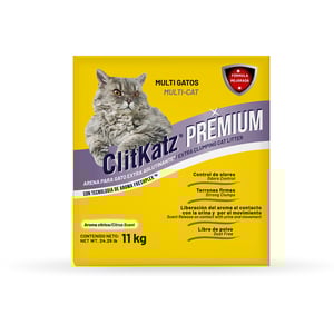 ClitKatz multi-gato es arena de arcilla extra aglutinante que forma aglutinados resistentes, diseñada con Freshplex, una innovadora tecnología que ayuda a bloquear los líquidos y los olores al contacto ayudando a garantizar una limpieza eficiente y un aroma a limpio durante días, con una formulación libre de polvo y un aroma cítrico que se libera al momento de utilizar el arenero es ideal para hogares más de un gato, una gran opción para el control del olor que toma en cuenta tu comodidad y la salud de tu felino.
