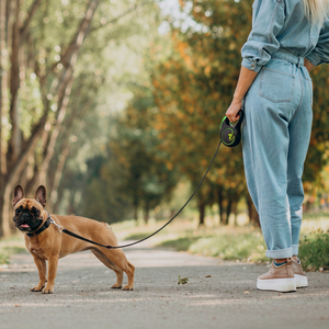 La correa retráctil Flexi es ideal para perros que no se jalan, ya que les permite moverse y explorar con libertad sin comprometer su seguridad. Su diseño liviano y resistente incorpora un botón de freno de fácil uso para ajustar la distancia según lo necesites. Además, ofrece un agarre ergonómico y un acabado elegante que brindan control y comodidad en cada paseo.