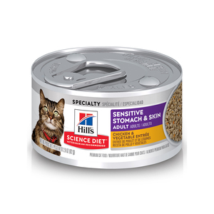 El alimento húmedo en lata Hill's Science Diet Adult Sensitive Skin & Stomach, para gatos adultos con piel y estómago sensibles, es una elección excelente para proporcionar a tu gato una nutrición que es suave para su sistema digestivo mientras nutre su piel y promueve un pelaje lustroso y saludable. Gracias a la ciencia, este alimento está formulado con un complejo de vitaminas y minerales que apoyan la salud digestiva y cutánea de tu mascota. Cada lata ofrece un delicioso asegurando que incluso los felinos más exigentes se sientan satisfechos con su comida. Además, el diseño de la lata fácil de abrir hace que la hora de la comida sea conveniente y sin complicaciones, permitiéndote servir una comida fresca. Este alimento húmedo ha sido especialmente diseñado para gatos con necesidades dietéticas específicas, proporcionando una nutrición completa y equilibrada que ayuda a mantener la piel sana y un pelaje brillante. Hill's Science Diet es la marca de alimento para gatos recomendada por veterinarios en EUA, con 100% de satisfacción garantizada o te devolvemos tu dinero. Al elegir Hill's Science Diet para tu gato con piel y estómago sensibles, estás confiando en una marca comprometida con la nutrición de calidad y el cuidado de la salud de tu querido gato.
