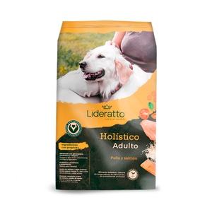 - Lideratto es alimento natural receta pollo y salmón para perros adultos de raza mediana y grande.