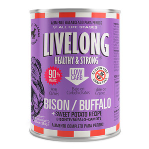 Livelong Healthy & Strong Bisonte y Camote es un alimento 100% natural para perros con 90% carne de bisonte, cerdo y res. Contiene además camote y vegetales orgánicos. No contiene granos de ningún tipo. Proteína de alta digestibilidad que provee todos los aminoácidos esenciales. Para agregar valor nutricional y una mejor fuente de proteínas, combinamos nuestra receta de bisonte con cerdo y res y también con hígado, ya que es una excelente fuente de vitaminas y hierro.