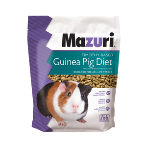 Mazuri Guinea Pig es una dieta completa, fórmulada para cubrir los requerimientos nutricionales de los cuyos durante todas las etapas de vida. Se presenta en forma de pellet con heno Timothy, el cual proporciona menos proteínas, un buen porcentaje de fibra y un excelente equilibrio mineral para los cuyos en todas las etapas de la vida. Este alimento es altamente palatable, contiene las cantidades de vitamina C que ellos necesitan y es rico en fibra para apoyar la actividad de masticación. No se necesita suplementación cuando se usa este alimento.