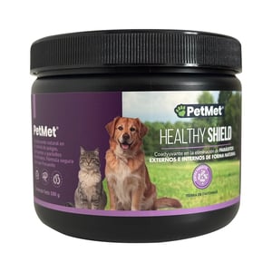 Healthy Shield de Petmet es un antiparasitario interno y externo 100% natural, eficaz, inocuo y económico. Esta compuesto de conchas fosilizadas de grado alimenticio que disecan el recubrimiento graso externo de pulgas y garrapatas eliminándolas de forma segura. Cuenta con hasta 15 minerales que al ser consumidos por tu mascota funcionan como desparasitante de mantenimiento eliminando de forma efectiva y mecánica parásitos internos. Healthy Shield ayuda a eliminar pulgas, garrapatas, ácaros, arañuelas, caracoles, chinches, cucarachas, hormigas, piojos, pulgones, termitas entre otros.