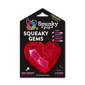 Tan brillante como un diamante, los juguetes de Spunky Pup de la línea Squeaky Gems se convertirán en los favoritos de tu mascota. Con un diseño increíble de gema brillante, este juguete permite un rebote irregular a la hora del juego gracias a su forma de corazón. Además de contar con un squeaker, este juguete flota en el agua para llevar la diversión a todo terreno.