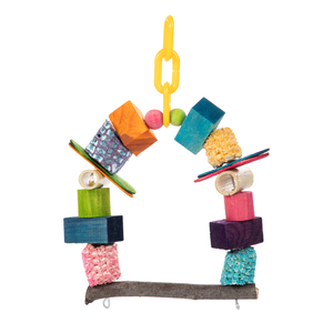 movimiento a aves pequeñas. Favorece su actividad diaria y estimula su curiosidad. Esta elaborado con materiales naturales, texturas y formas variadas como; madera con corteza, olote seco, madera de pino, carrizo, cuentas y cucharas de madera pintadas con colorantes naturales. Los juguetes naturales promueven el juego activo y desgaste de pico, estimula la curiosidad y la actividad física. Es recomendable para aves como, agapornis, periquitos australianos, periquito inglés, forpus, canarios, finches, entre otras.