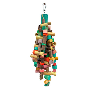 Tiki totem mediano es un juguete de exploración hecho con madera natural, yute, lufa, carrizo y piñas de pino, sin elementos tóxicos, es ideal para que tu ave se mantenga entretenida y saludable. Este juguete ofrece una experiencia similar a trepar ramas, ideal para picotear, trepar y jugar. Puede colgarse en posición vertical u horizontal, estimulando el forrajeo y el desgaste del pico. Apto para aves medianas, como, conuros, entre otros loros. Medida aprox 25 cm de largo.
