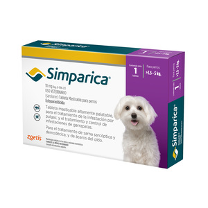 Las tabletas masticables con sabor palatable Simparica se utilizan para la eliminación y tratamiento de infestaciones de pulgas (Ctenocephalides feliz y C. canis), garrapatas (Rhipicephalus sanguineus) y de los ácaros que provocan sarna (Demodex canis, Sarcoptes scabiei) en perros a partir de las 8 semanas de edad. Rompe el ciclo de la pulga, disminuye las lesiones en piel y evita el riesgo de transmisión de enfermedades infecciosas.