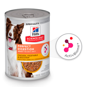 El alimento húmedo Hill’s Science Diet Perfect Digestion ha sido elaborado especialmente para apoyar la salud del microbiota y del sistema digestivo de perros adultos de todas las razas. Es por esta razón que cuenta con la tecnología ActivBiome+, una mezcla exclusiva de prebióticos y calabaza adicionada, que además ayudará a mejorar la calidad de las heces. Cuenta con proteína de alta calidad, minerales balanceados y un delicioso sabor.