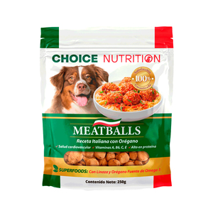 Los premios Meatballs de Choice Nutrition son los mejores snacks para consentir a tu perrito con un clásico de la cocina italiana. Inspirados en una receta de albóndigas, estos suaves premios además de ser deliciosos son una opción muy saludable, ya que están elaborados con ingredientes estrella como semillas de linaza y orégano, ricos en ácidos grasos esenciales y vitaminas A, B6, C y E.