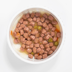 Suficiente agua para el proceso; carnes y subproductos de cerdo, y/o aves y pavo; derivados de origen vegetal (maicena, celulosa, fibra de chícharos, pulpa de betabel, almidón de patatas) agente de palatabilidad (glicina); verduras (chícharos, zanahorias), agente espesante y/o gelificante (goma xantana y/o algarroba, y/o goma de celulosa); varios azucares; taurina. Minerales: Sulfato de cobre, manganeso, zinc, tripolifosfato de sodio, cloruro de sodio, yodato de potasio, cloruro de potasio. Vitaminas: Suplementos de vitamina E, tiamina (B1), vitamina B6.