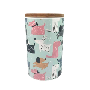 Mantén frescos los premios favoritos de tu mascota con el contenedor Snooty de Park Life Designs. Este práctico y elegante recipiente resalta por su patrón de perritos con diseño tipo doodle. Está fabricado en cerámica duradera y cuenta con una tapa de bambú hermética, lo que lo convierte en la opción perfecta para almacenar comida o premios, manteniéndolos frescos mientras aporta un toque de estilo único a tu hogar.