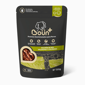 - Boün+ Premio Deshidratado Tipo Jerky para Perro Receta Pulmón de Res Valeriana y Colágeno, 120 g >PRODUCTOS>Perro>Premios, Carnazas y Toppings>Premios>Boün+ Premio Deshidratado Tipo Jerky para Perro Receta Pulmón de Res Valeriana y Colágeno, 120 g