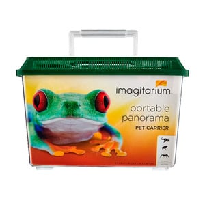 Nuestra transportadora Imagitarium para reptiles, anfibios e insectos es un hogar temporal o transporte ideal para tus reptiles. Su base bien ventilada esta hecha de plástica traslucido fácil de limpiar. Tu mascota reptil, anfibio o insecto estará sano y salvo, porque nuestra transportadora tiene una tapa que cierra fácilmente y esta diseñada para tener una excelente ventilación, una puerta grande de acceso con una ventana transparente, esta ventana nos ayuda a la hora de alimentar y revisar a tus mascotas, y entradas para accesorios y tubos de aire. De apariencia genial, los Hábitats de plástico fáciles de mantener para escritorios o viaje ofrece una visión completa de tus lagartos, víboras, sapos, ranas, insectos, cangrejos ermitaños, tritones, etc.
